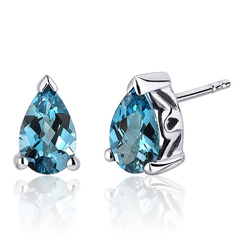 Center Stone: 2 Pieces Genuine London Blue Topaz, Pear Shape with Checker Board Top 8 x 5 mm, 1.50 carats total weight, Caribbean Blue Hue with Brilliant Sparkle. Earrings: 2.10 grams, Pure Sterling Silver with .925 stamp, Earrings feature Stud posts with Bullet backs, exceptional Design, Craftsmanship and Rhodium finishing. Perfect gift for Mothers Day, Birthdays, Valentines Day, Graduation, Christmas or just about any other occasion. Money Back Guarantee. Includes a Signature Gift Box , style PER-SE8040